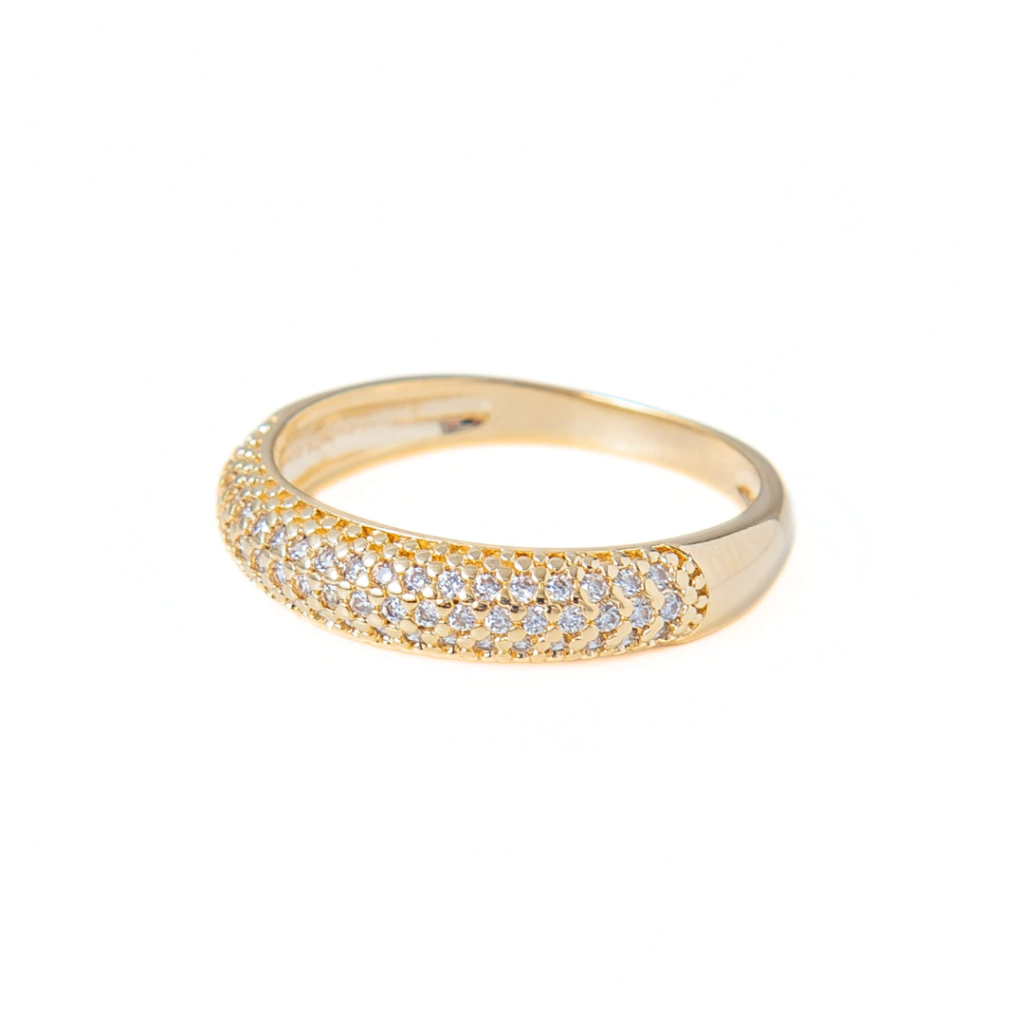 Anel aparador com zircônias banhado em ouro. O clássico perfeito para combinar com sua aliança, solitário ou simplesmente utilizar sozinho, garantindo brilho e glamour a qualquer ocasião.