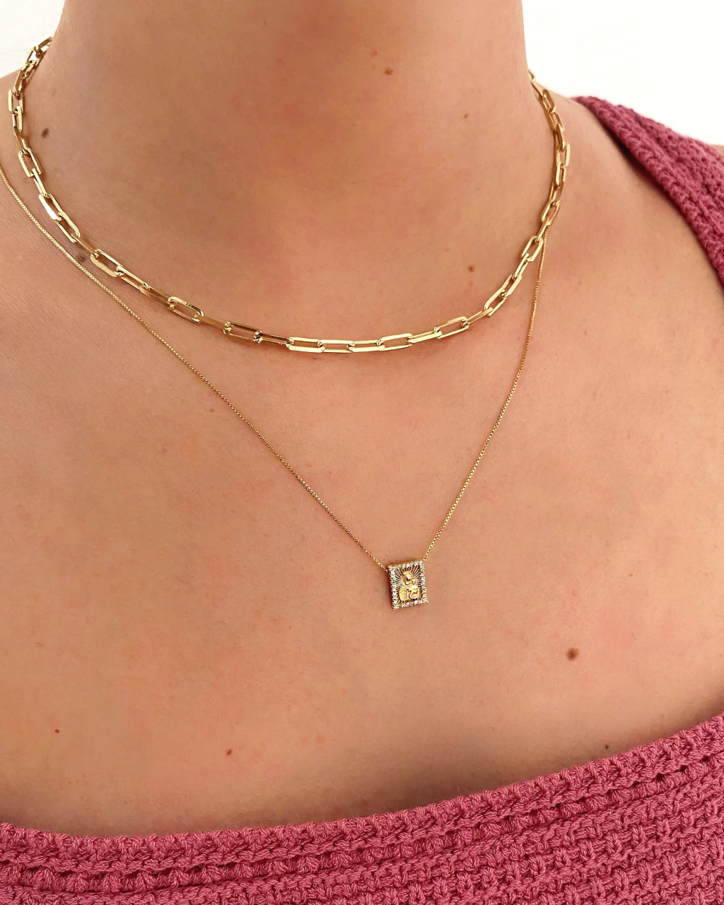 Escapulário Nossa Senhora do Carmo e Sagrado Coração de Jesus com zircônias banhado em ouro. Escapulários religiosos são peças lindas e especiais, perfeitos para demonstrar sua fé ou presentear uma pessoa especial. Esse modelo com os pingentes cravejados nas bordas, traz ainda mais brilho e delicadeza!