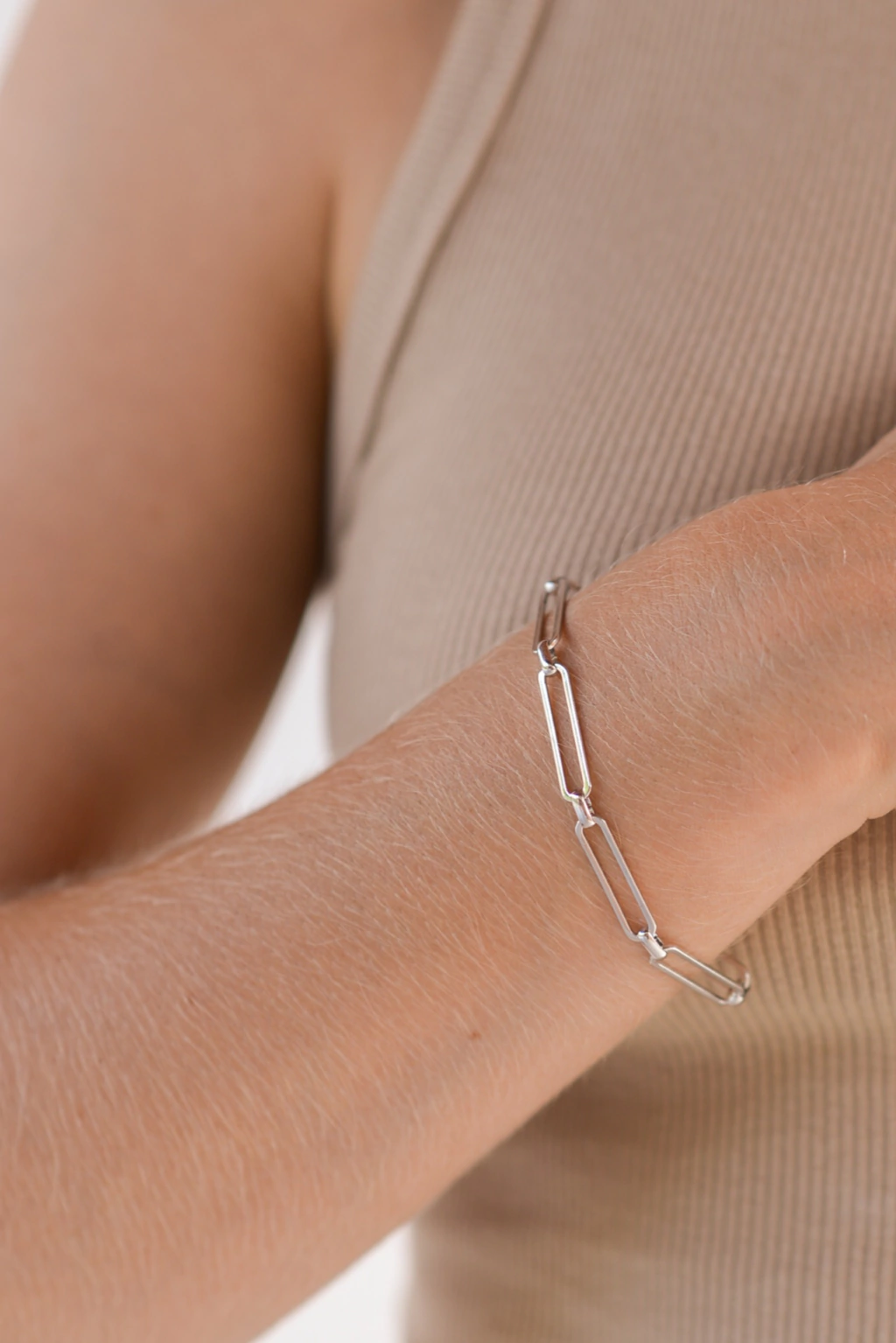 Pulseira corrente de elos banhado em ródio. Uma peça linda e moderna, para quem gosta de usar o poder das correntes ao seu favor, trazendo mais estilo e imponência! Nesta versão diferenciada, os elos são retangulares e mais alongados. O fecho do tipo boia permite adicionar pingentes de sua escolha para complementar a produção. Experimente combinar com o colar do mesmo modelo!